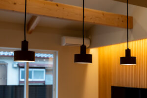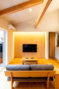 勾配天井に梁が映えるリビングは、コンパクトながらも開放感を実現しています。